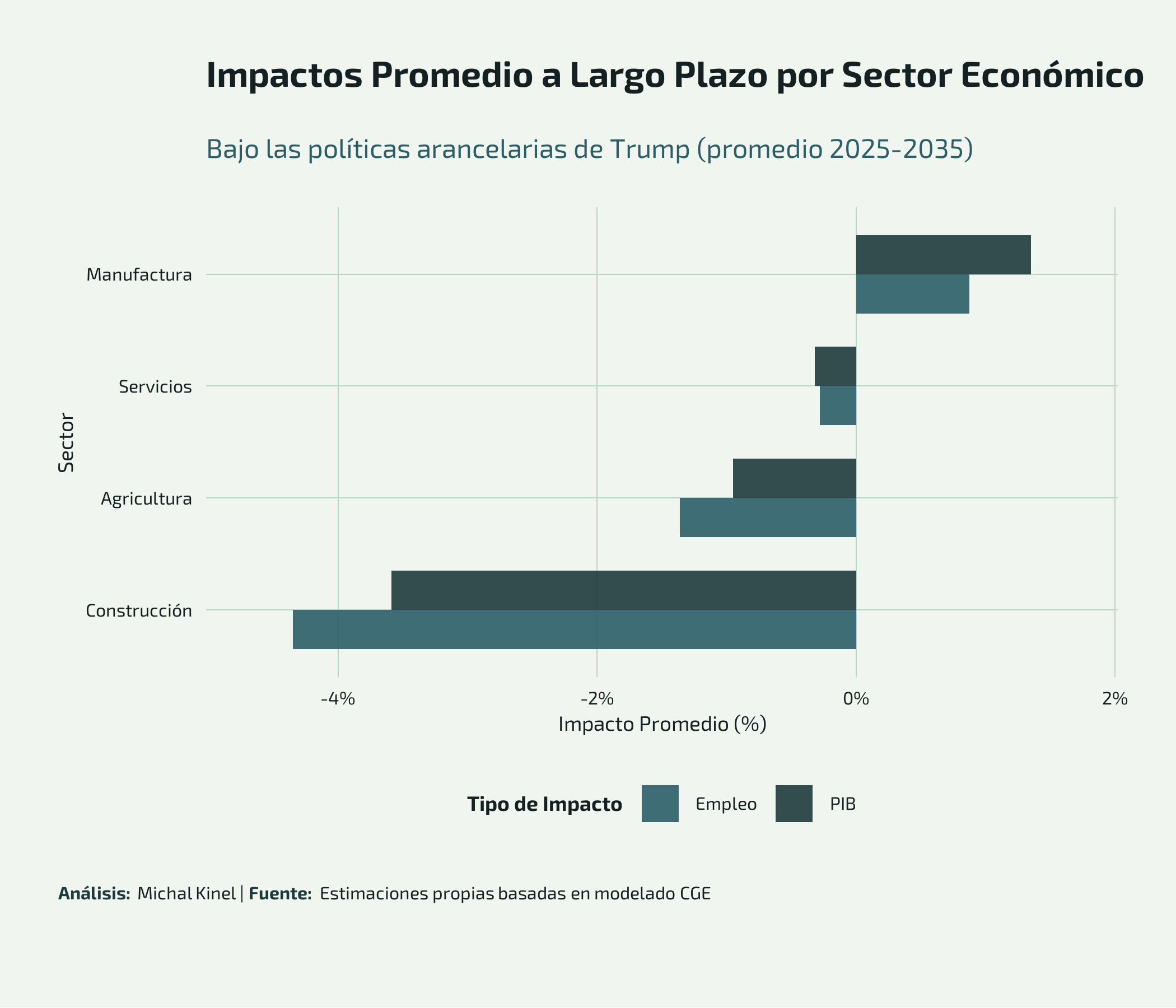 El análisis sectorial revela que los beneficios arancelarios se concentran en industrias protegidas mientras los costos se distribuyen ampliamente a través de la economía. La agricultura y construcción soportan cargas desproporcionadas, mientras los servicios experimentan efectos indirectos pero significativos. Las proyecciones a largo plazo sugieren que estos impactos persisten y, en algunos casos, se intensifican con el tiempo a medida que evolucionan las dinámicas competitivas.