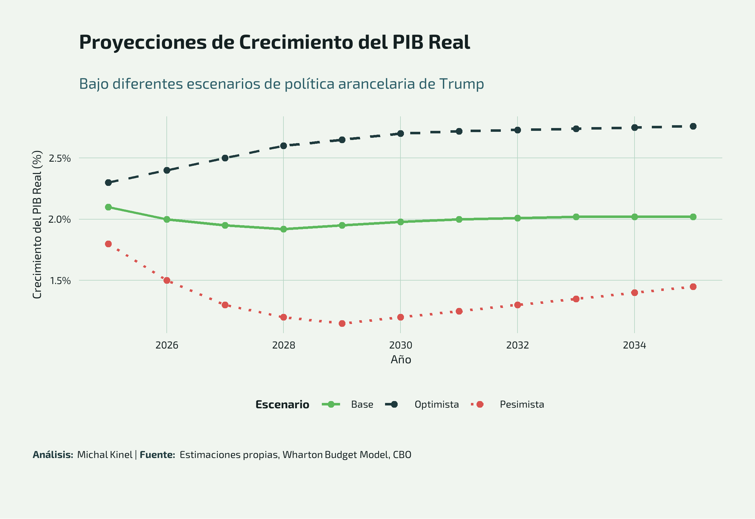 El modelado económico revela trayectorias de crecimiento divergentes a largo plazo dependiendo de la efectividad política y las respuestas internacionales. Bajo supuestos de línea base, el crecimiento del PIB real declina del 2.1% en 2025 al 2.02% en 2035, representando un lastre persistente de aproximadamente 0.4-0.6 puntos porcentuales relativo a las proyecciones pre-arancelarias.