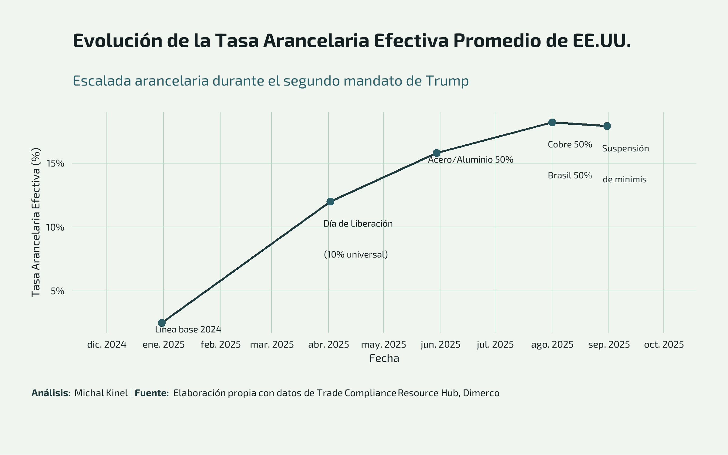 La segunda administración Trump ha implementado el régimen arancelario más comprehensivo en casi un siglo, elevando la tasa arancelaria efectiva promedio estadounidense del 2.5% en 2024 a aproximadamente 18 puntos porcentuales adicionales en 2025. Esta política comercial representa una transformación fundamental de las relaciones comerciales de Estados Unidos con implicaciones estructurales profundas para la economía doméstica.