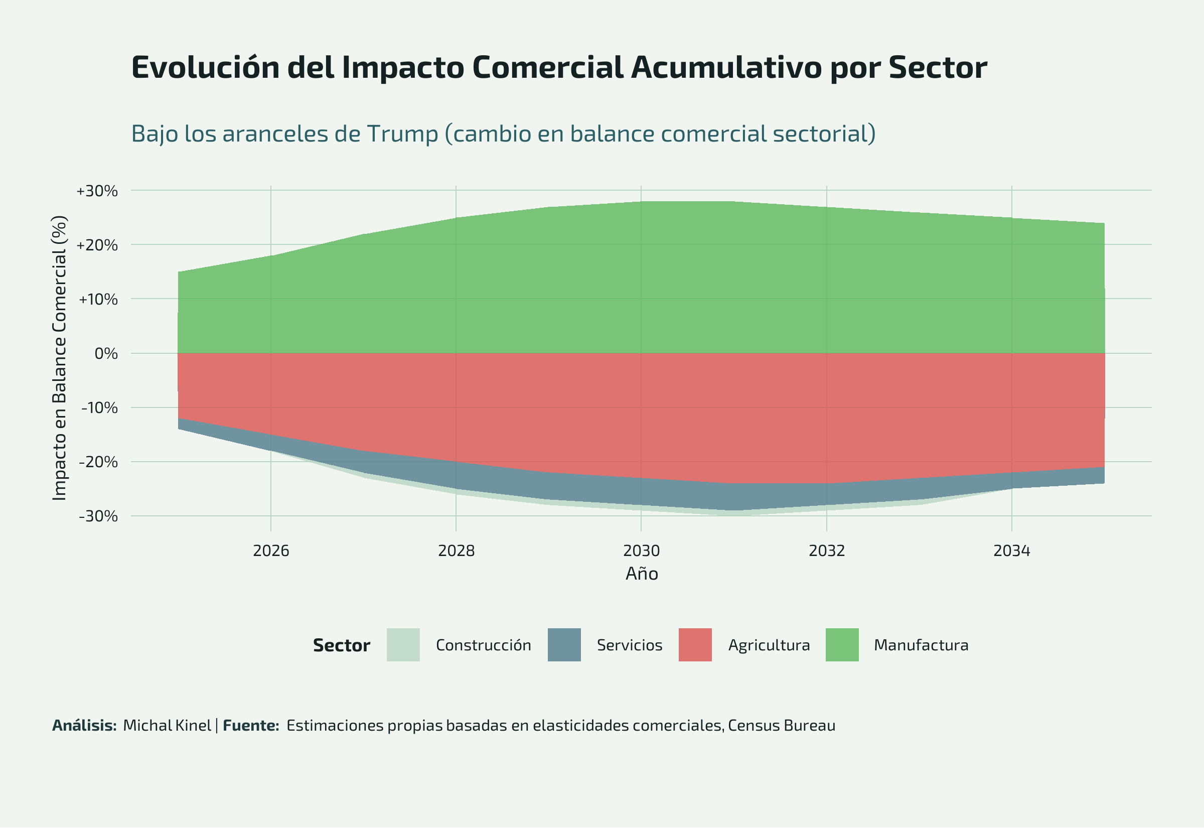 El análisis revela una divergencia sectorial marcada en los impactos arancelarios. La posición protegida de la manufactura permite ganancias iniciales, pero estas disminuyen con el tiempo a medida que aumentan las presiones de costos. La agricultura, construcción y servicios enfrentan efectos negativos persistentes que se agravan durante el período de proyección.