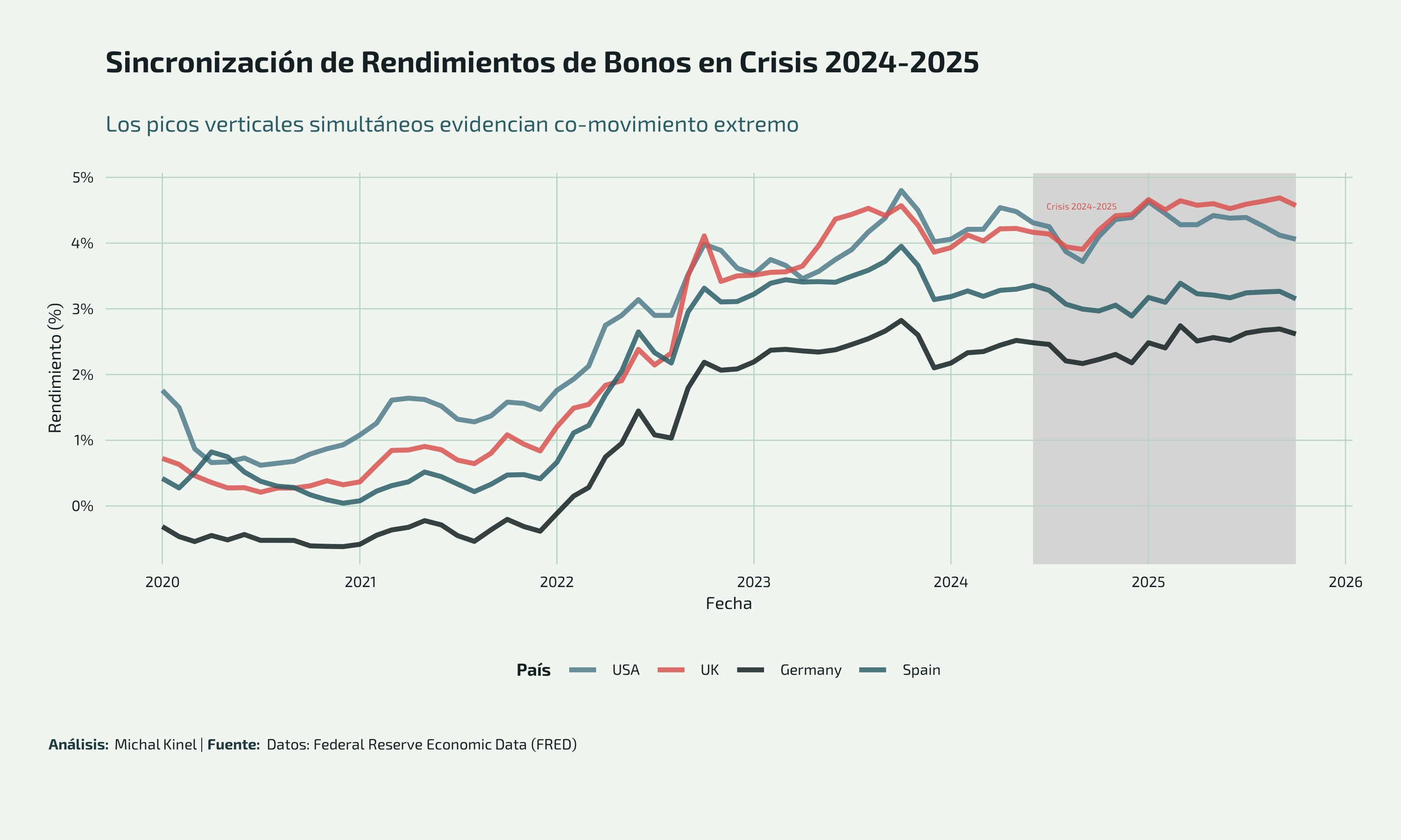 La figura muestra la evolución de los rendimientos desde 2020, destacando cómo durante la crisis de 2024-2025 (área sombreada) los movimientos se sincronizan verticalmente, indicando transmisión simultánea de shocks.