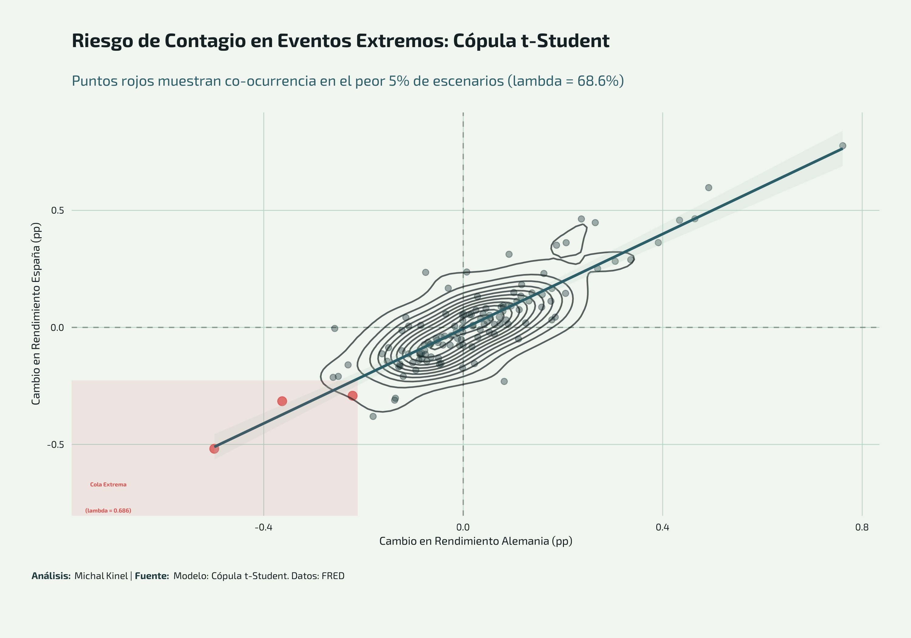 Interpretación: Este coeficiente es alarmante. Significa que, en el peor 5% de los escenarios (un colapso del mercado de bonos), existe una probabilidad del ~69% de que España sufra ese colapso simultáneamente con Alemania. La “seguridad” de diversificar comprando Bunds alemanes desaparece casi por completo cuando ocurre el desastre.