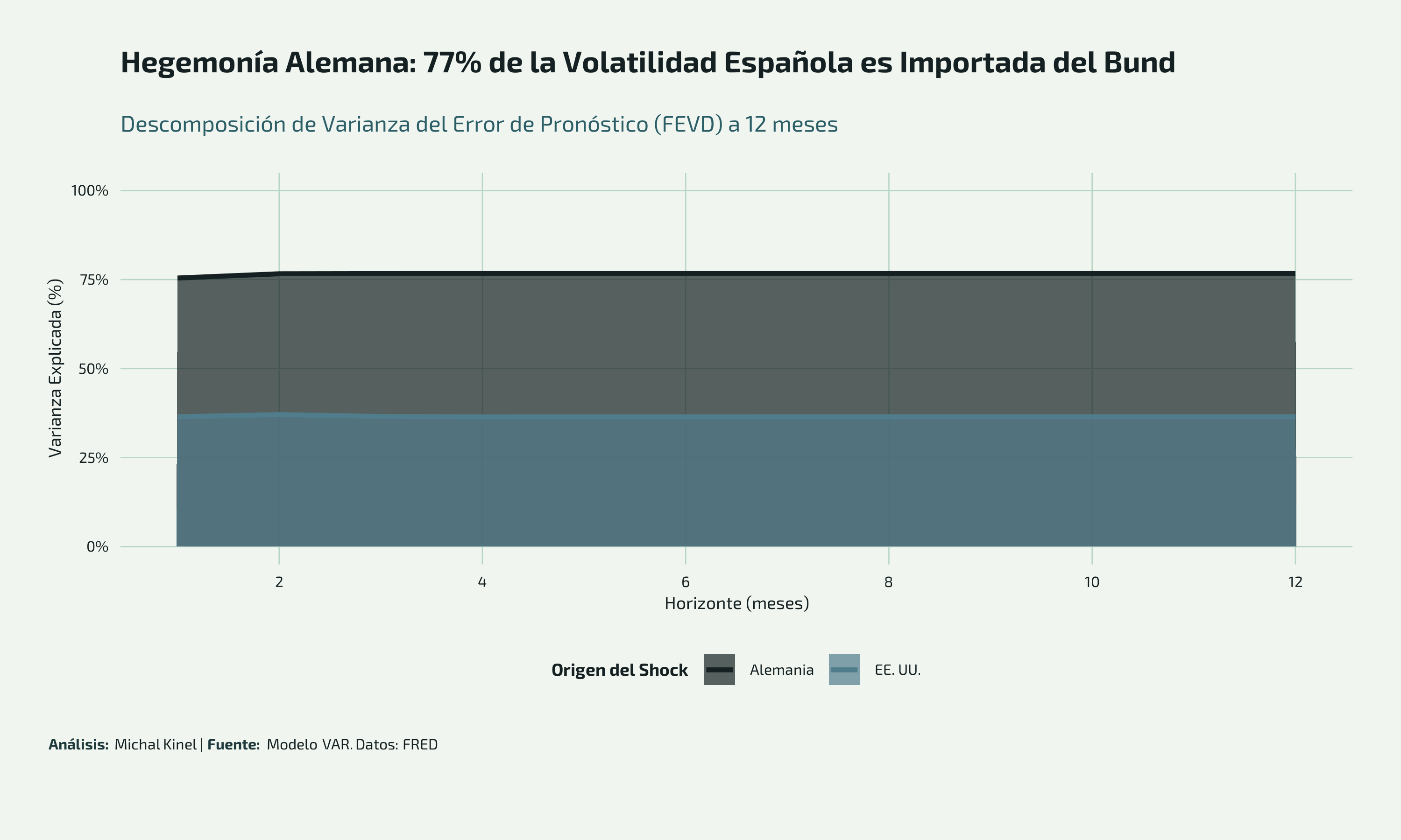 ¿Cuánto de la volatilidad española es “importada”? El análisis de Descomposición de Varianza (FEVD) a un horizonte de 12 meses es contundente: