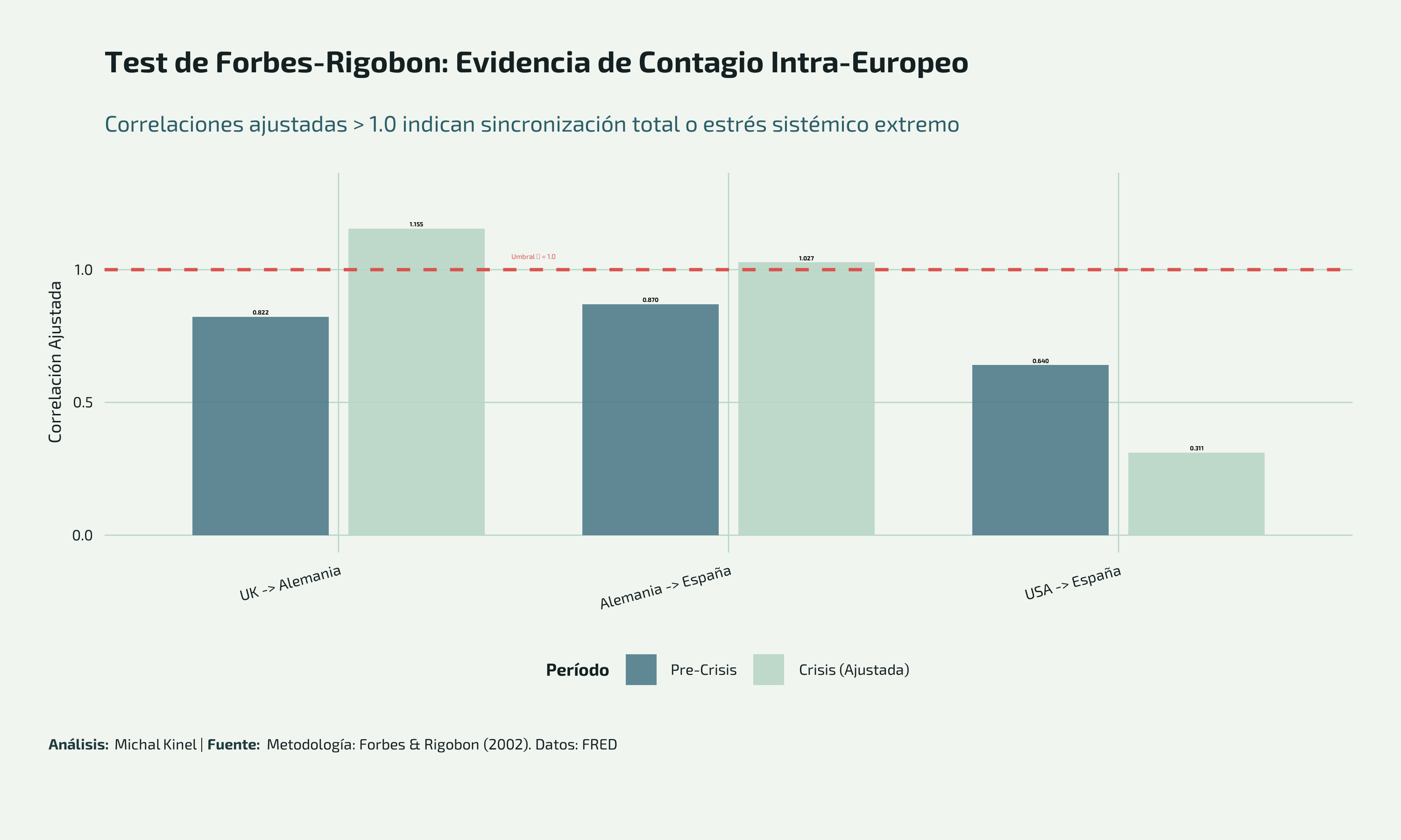 Es importante aclarar que los coeficientes ajustados (\(\rho^*\)) superiores a 1.0 no son errores. En la metodología de Forbes-Rigobon, estos valores son estimadores contrafactuales. Indican que la covarianza entre los mercados aumentó de forma tan violenta que supera el ajuste estándar por volatilidad. Económicamente, esto se interpreta como una sincronización total o un escenario de estrés sistémico extremo.