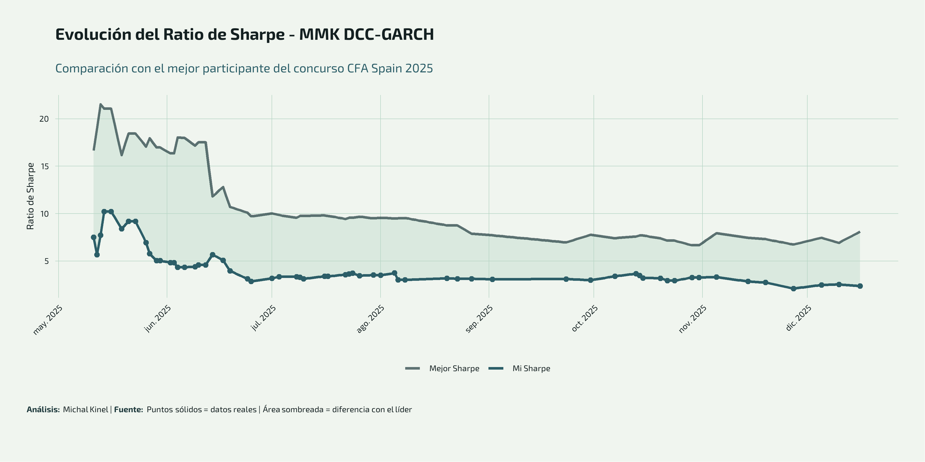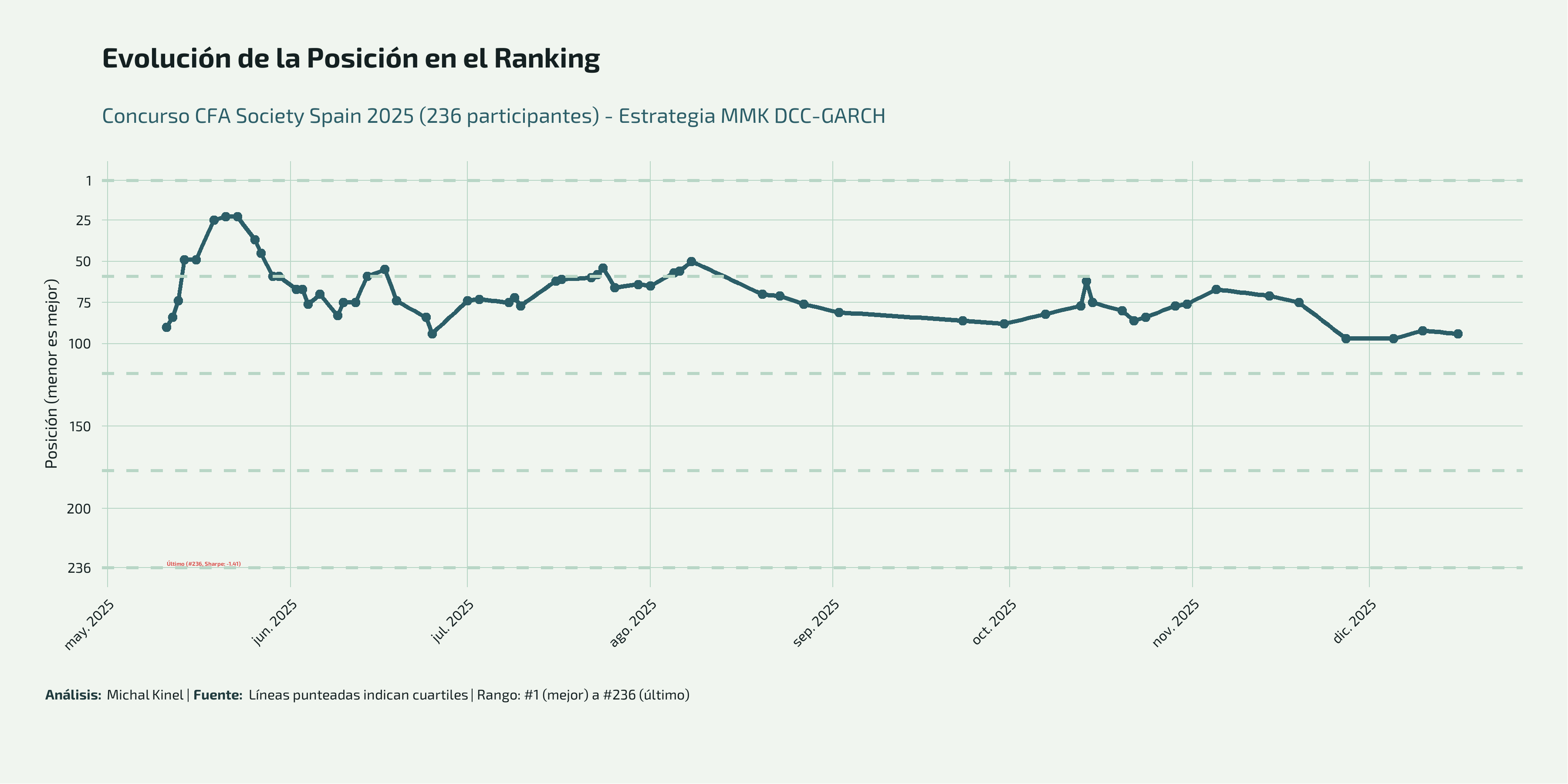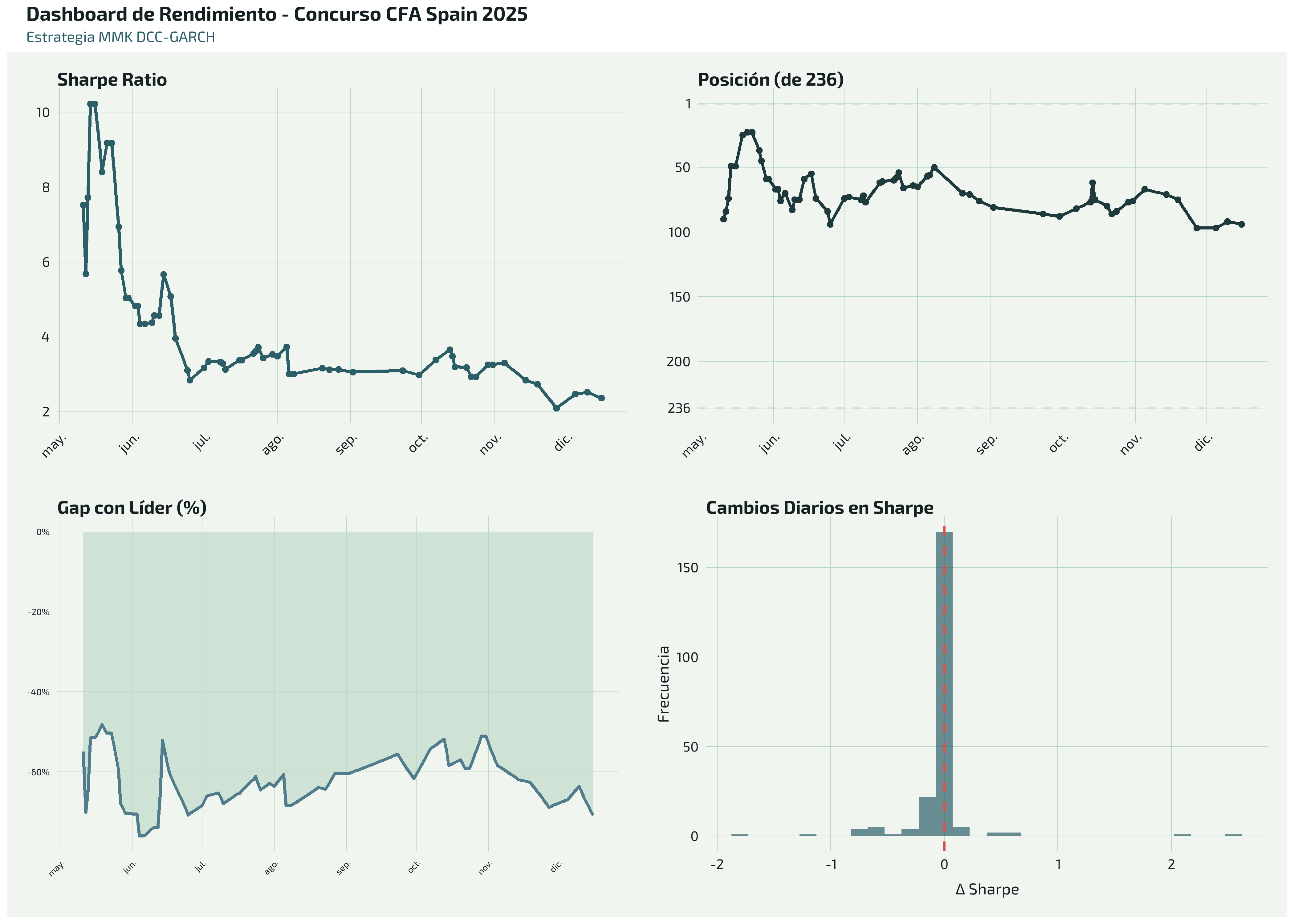 - Inicio volátil (Mayo): El Sharpe inicial comenzó bajo (~5-7) pero rápidamente escaló a máximos históricos de 10.23 a mediados de mayo, alcanzando la posición 23.