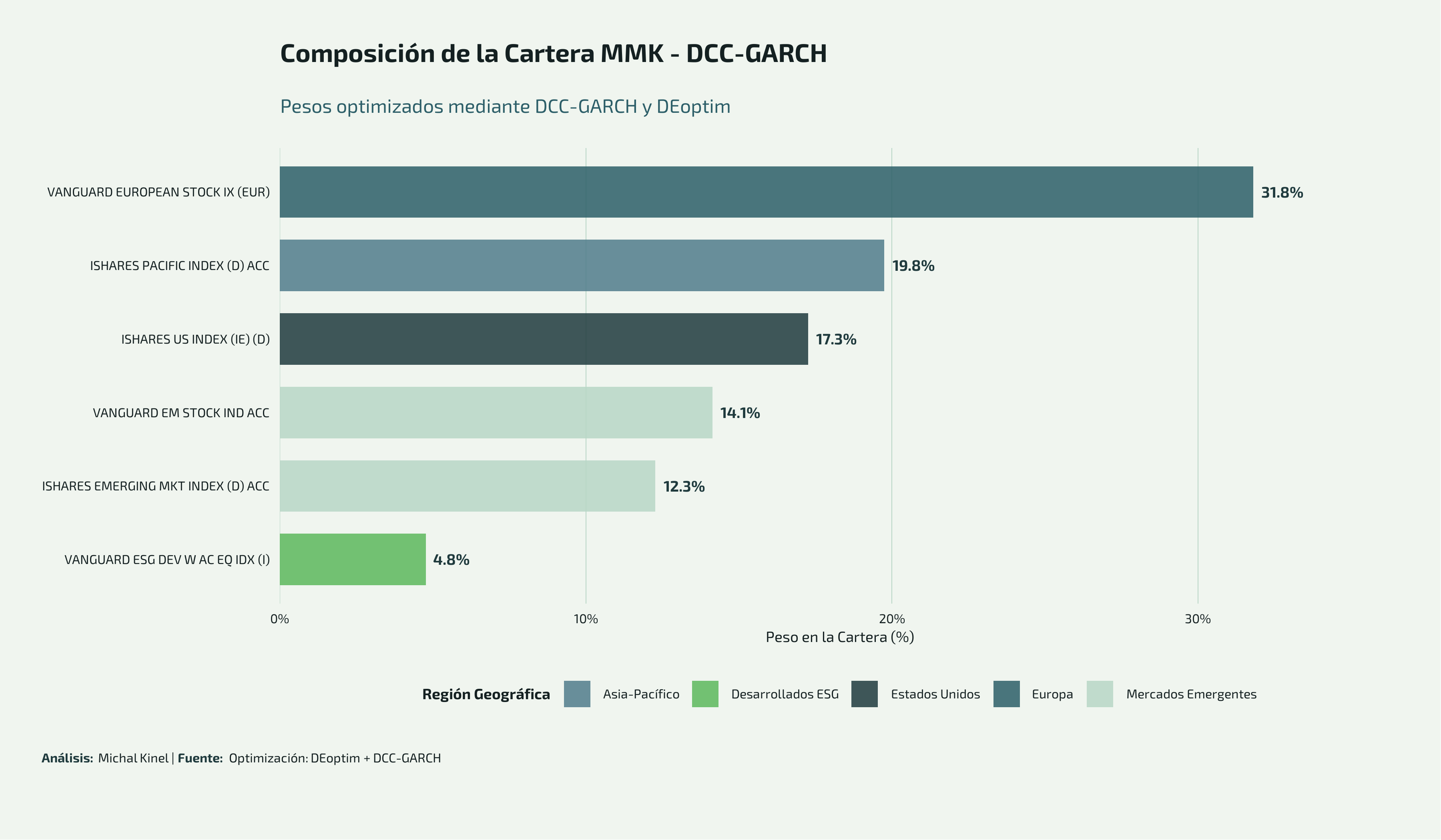 - Rebalanceo periódico: Re-optimizar mensualmente con nuevas proyecciones DCC-GARCH